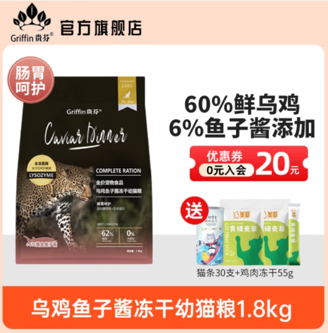 贵芬(GRIFFIN)鲜肉猫粮 乌鸡鱼子酱系列鲜肉全价冻干无谷物成猫幼猫奶糕猫主粮 ¥222.00
