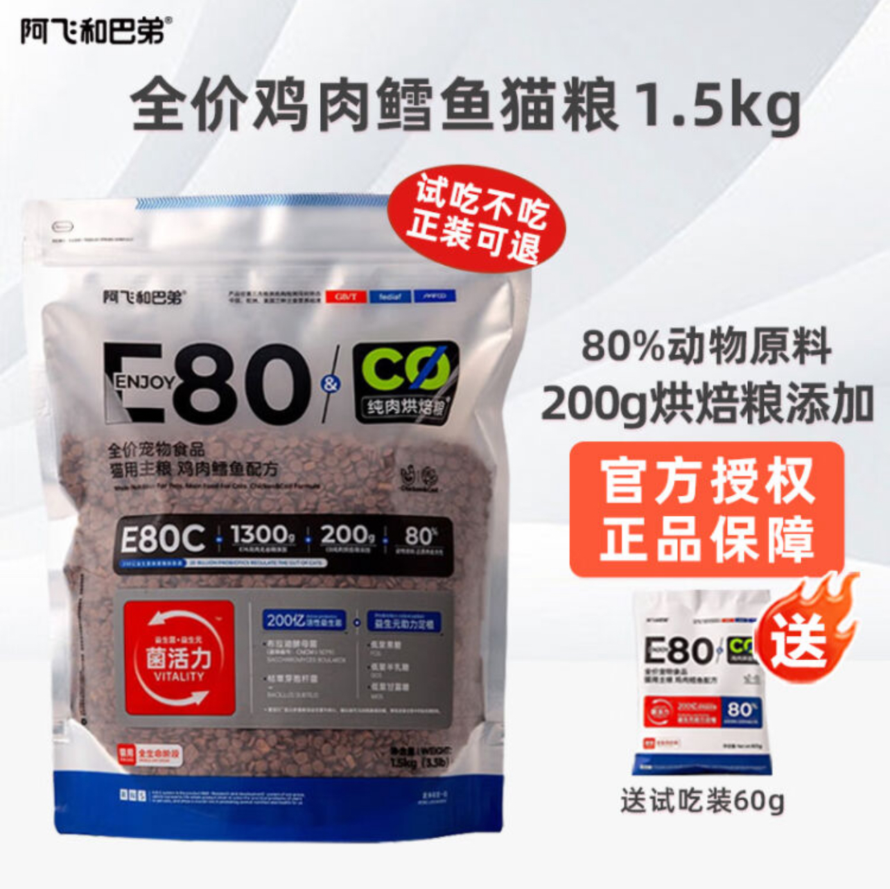 阿飞和巴弟E80C全价猫粮成猫粮幼猫粮 猫用主粮纯肉烘焙粮 鸡肉鳕鱼配方1.5kg