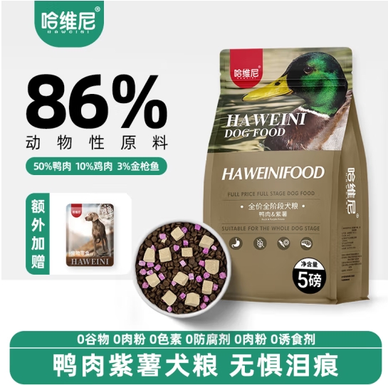 哈维尼狗粮通用型鸭肉紫薯天然冻干成犬粮全阶段通用泪痕改善降火 鸭肉紫薯5磅(2.27kg) 全犬期